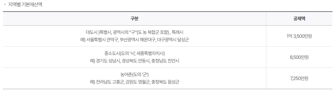 지역별 기본공제액 기준과 공제액을, 서울이나 6대 광역시, 특례시는 1억 3,500만 원을 공제해 주고 있고, 세종시, 중소도시는 8천5백만 원을 공제하고, 농어촌은 7천250만 원을 공제하고 있습니다.